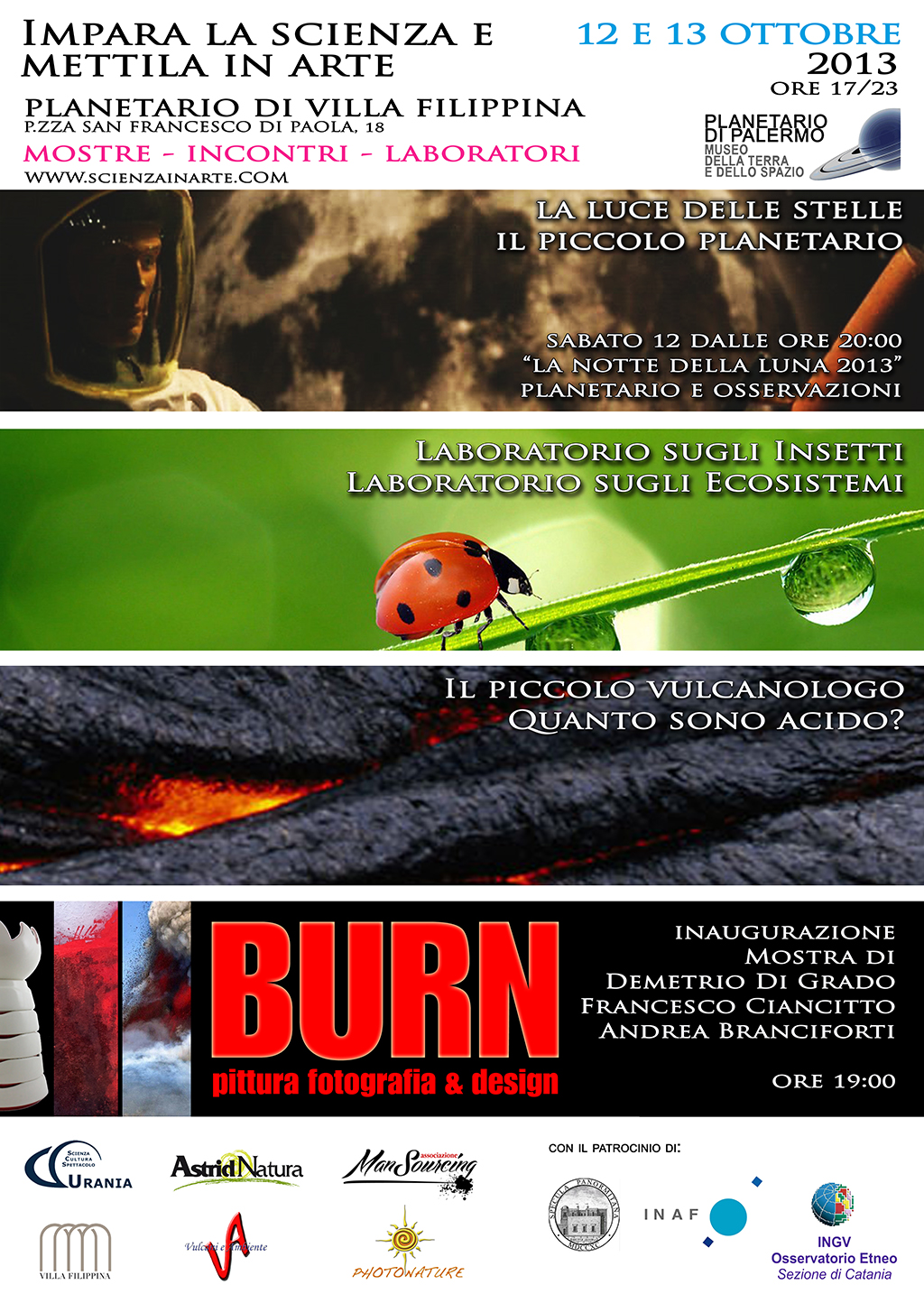 Non solo Arte in questa manifestazione, che avrà un seguito con altri eventi, ma la Scienza in primo piano con il coordinamento di tre associazioni, URANIA, ente gestore del Planetario, ASTRID, ente gestore del Museo di Zoologia Doderlein e Vulcani e Ambiente. All’interno delle sale del Museo e sotto il porticato settecentesco, Mostre Scientifiche, incontri tematici, Laboratori per i bambini realizzati da ciascuna associazione. Sarà inoltre aperto e visitabile il Planetario e allestite le postazioni dei telescopi anche in occasione del MOONWATCH Party 2013 a cui il Planetario aderisce.